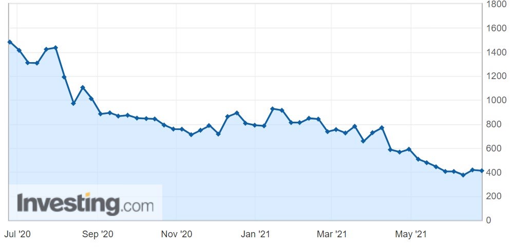 下記グラフの通り、米国新規失業保険申請件数6/24発表時後、申請件数は6月に入って下げ止まり、雇用の回復は足踏み。