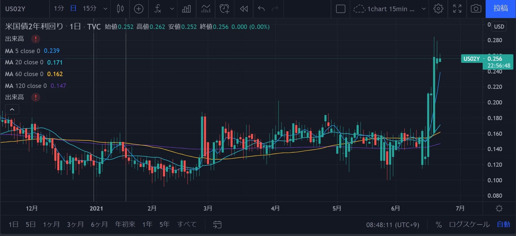 これから2年後の2023年にFFレートが0.6%になる見通しをFRBが公にしたことも、現在の2年金利を0.25%まで押し上げています。